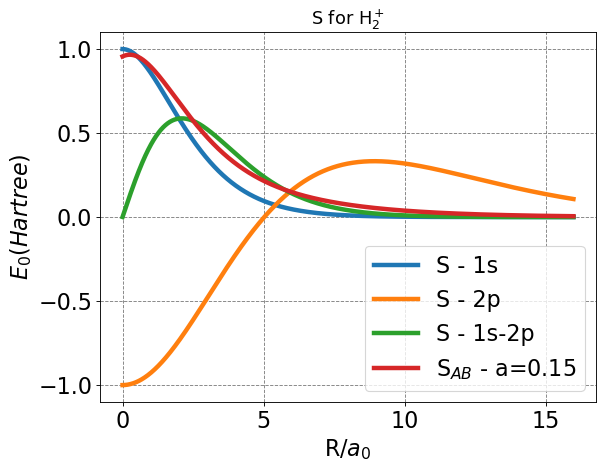 We have discussed in class before how checking your functions along the way while doing such involved and numerous integrations can be useful to ensure you are not baking incorrect functions into your code from the beginning. Below, we plot each of our individual \(S\)-type functions, and the combined \(S_{AB}\) function with a chosen \(a\) value.